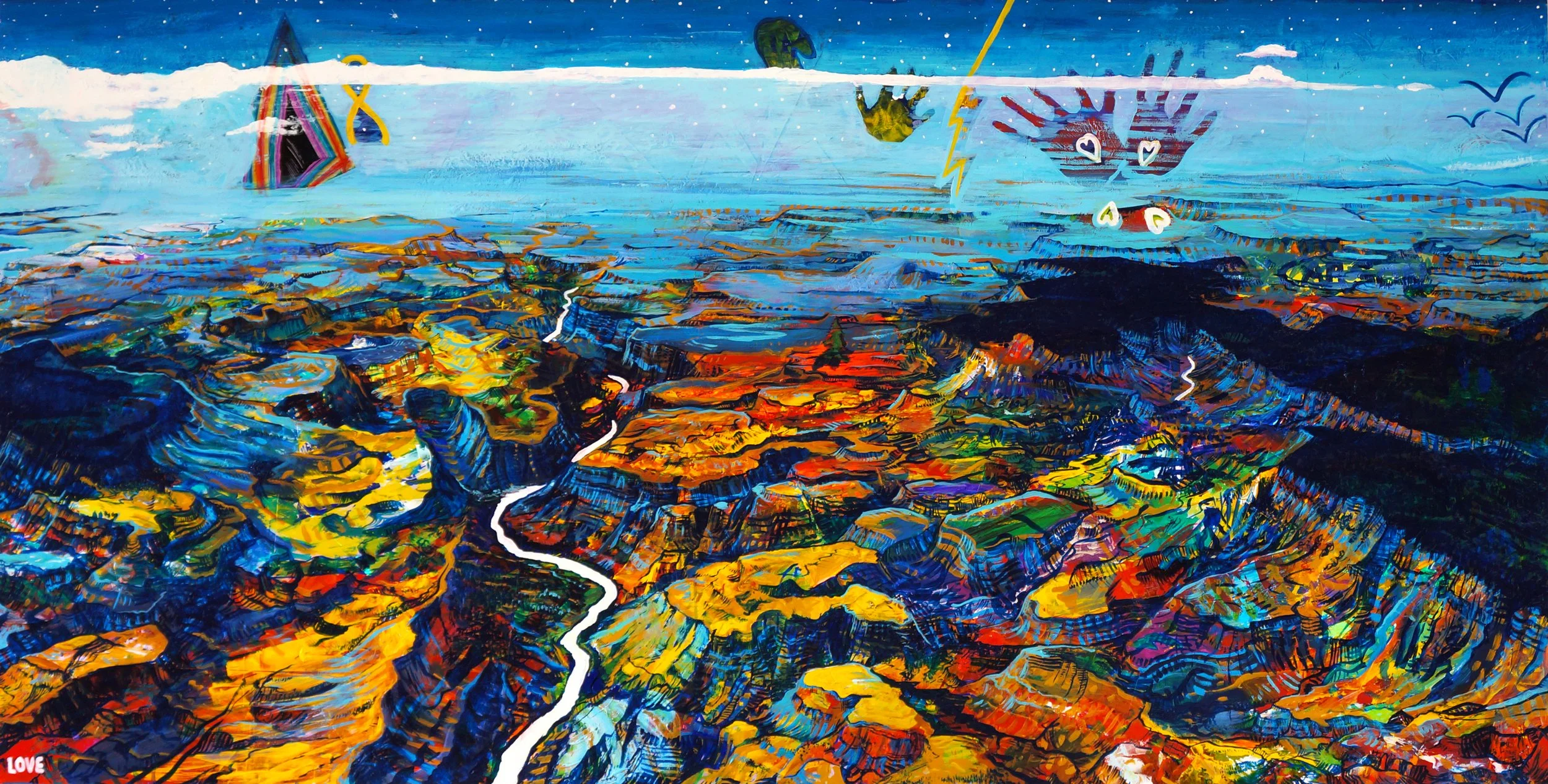 As part of our redesign of Carson’s Corner in 2023, we created a collaborative mural with Carson's family and the Girl Scouts of Northeast Ohio. This painting of the Grand Canyon comes from the aerial photo Carson’s family took on his final return home, shortly after he passed away on one of his beloved trips to the America’s national parks. Hidden across the landscape are creative visions, angels, books, memories, and messages of love to encourage others with a generous spirit.