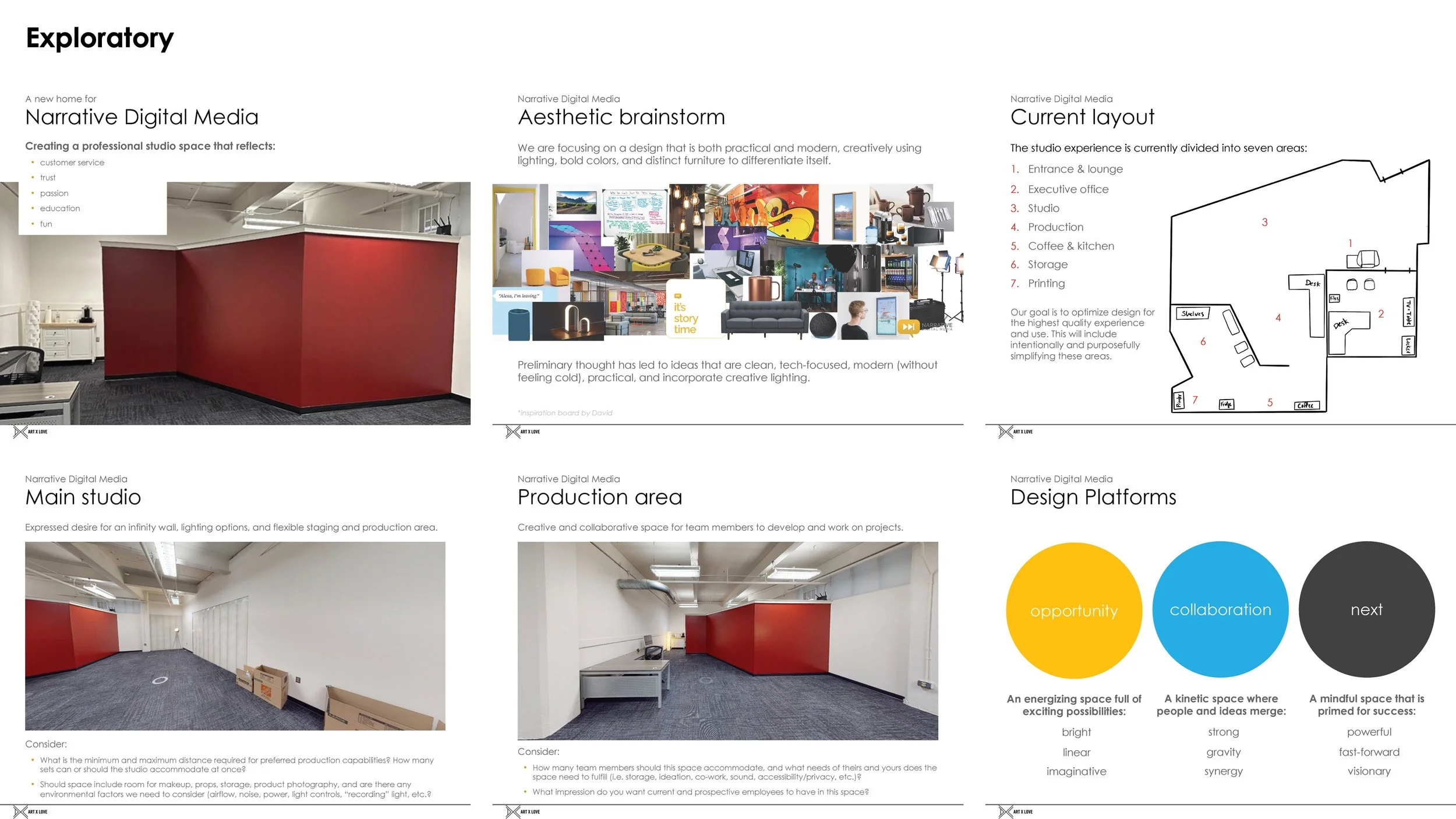 Once the conceptual platforms were refined, we worked with Mario to extend the select platform to a range of design executions for murals, workspaces, furniture, office supplies, lighting, and other elements that would help Mario realize his vision for the space. As mural concepts were being developed for the space, we also put together a contact sheet with options for Narrative Digital Media to purchase their own lighting, furniture, and decor to make the transition to the new space as easy and affordable as possible.