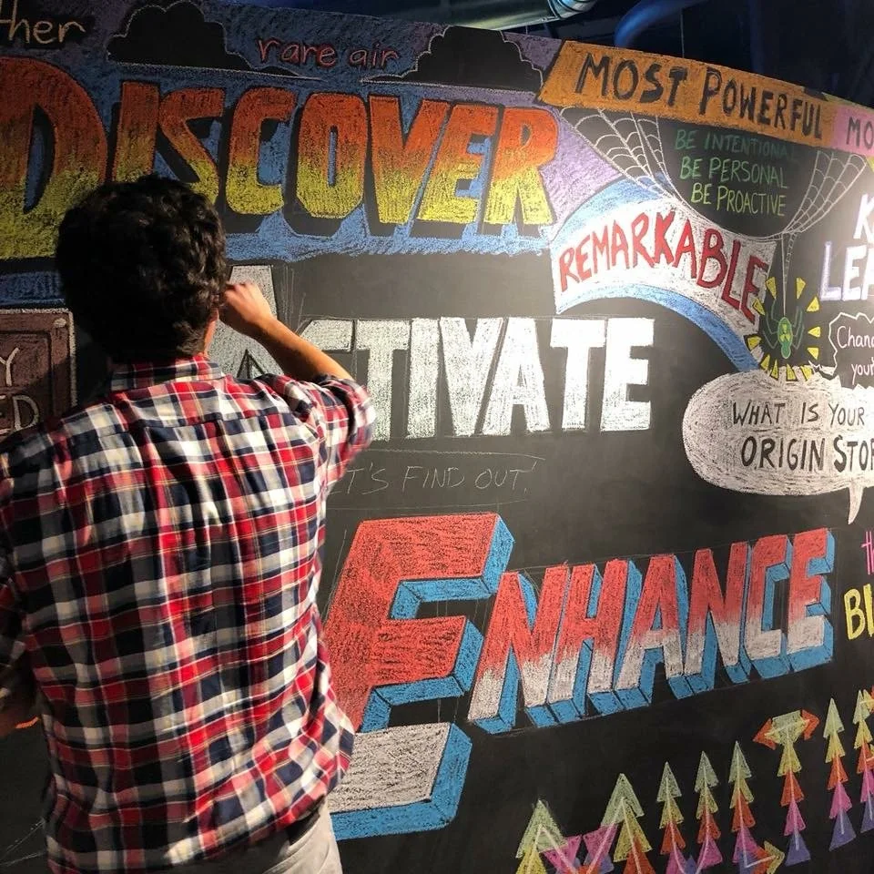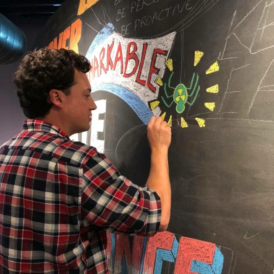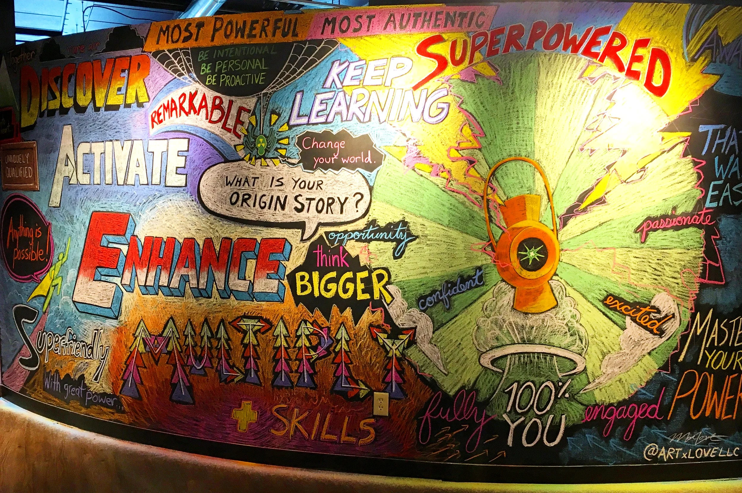 Mac was commissioned to create this chalk mural for SparkSpace’s offices and co-work space in Columbus, Ohio. The theme of the month was “Ordinary Superheroes.” Make conceived of and designed the mural on site, illustrating it freehand, and completed the mural in 6 hours.